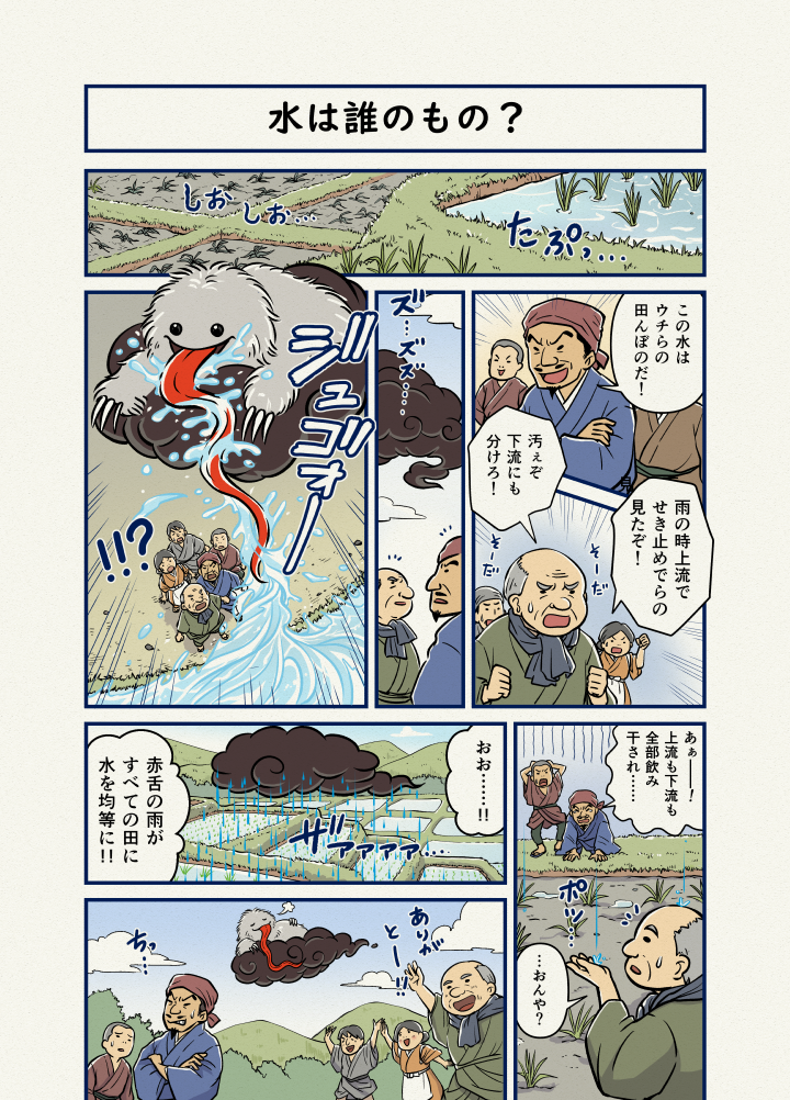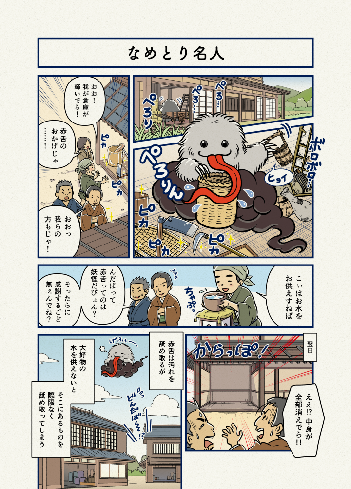 普段は黒い雲に乗っていて、宙に浮いているんだって。自慢の舌で垢や汚れを舐めとってくれるけど、「大好物の水」をお供えしないと、そこにあるものを際限なく舐めとってしまうみたい。