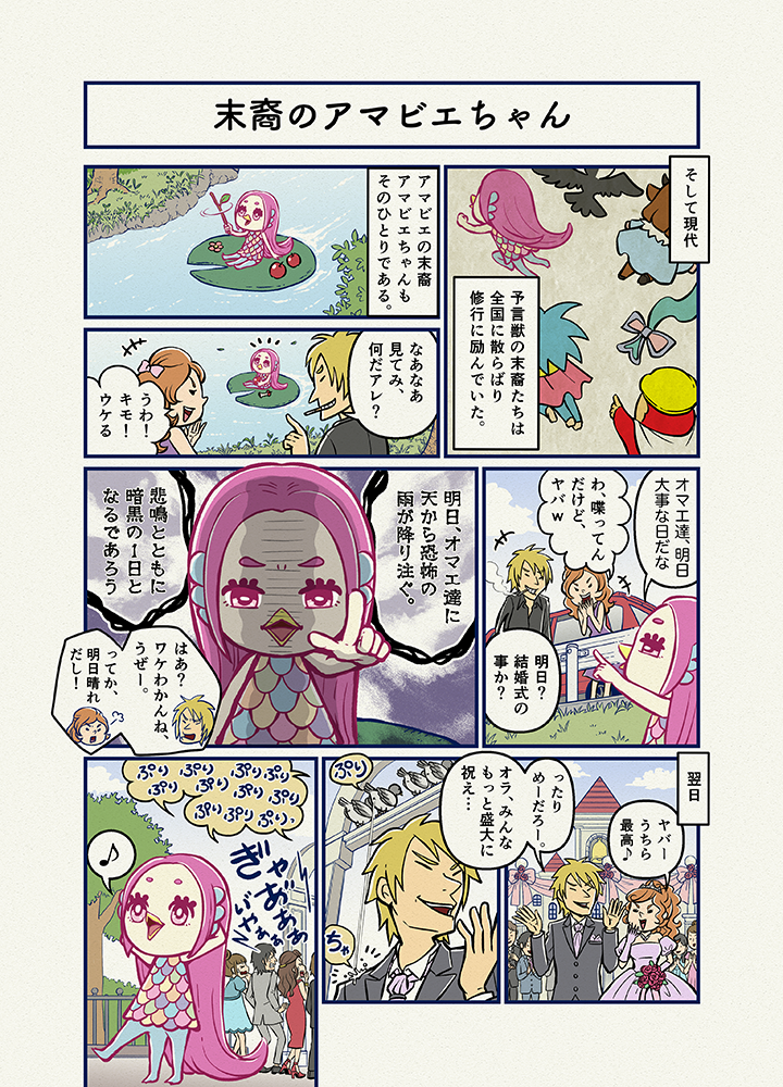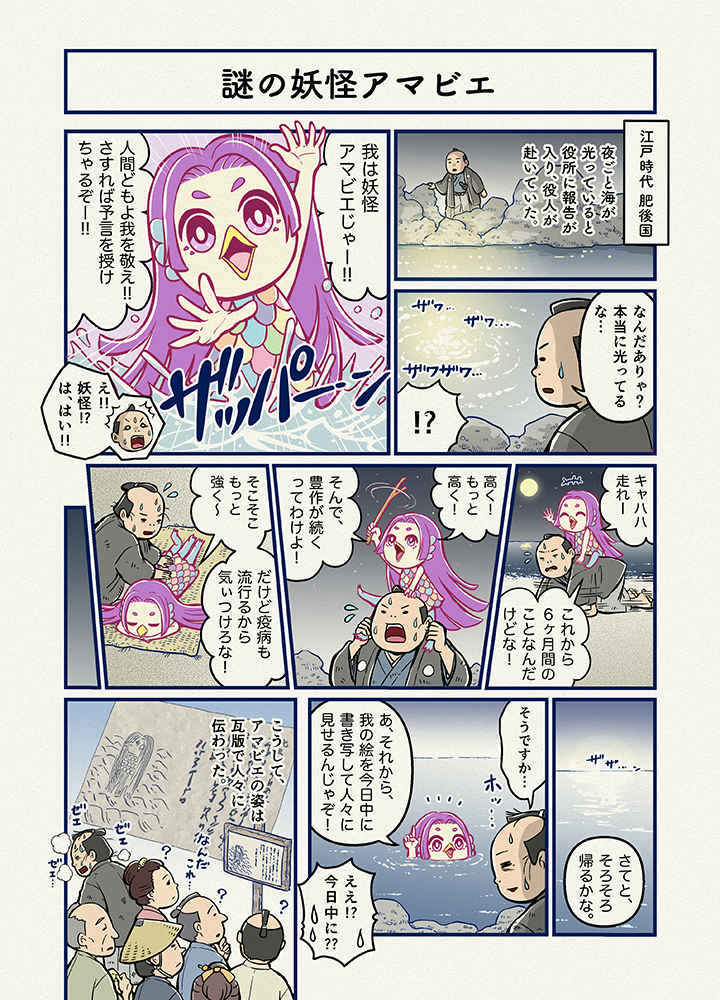 非常にかわいらしい見た目で、従来の妖怪のイメージとは全然違うんだそう。アマビエちゃんは災害や疫病の予兆を告げる存在とされていて、その言葉を聞くことで災厄を回避することができるんだとか。