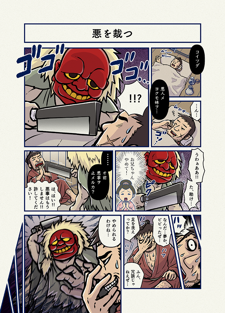 悪事から足を断つ、悪人を裁くことから「足裁」、狂言などでよく見られる武悪面から「武悪」をとって足裁武悪という名がついたそうだよ。