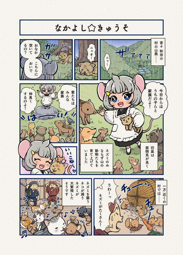 可愛そうに思った旧鼠は母猫の代わりに5匹の猫を育てたそうな。