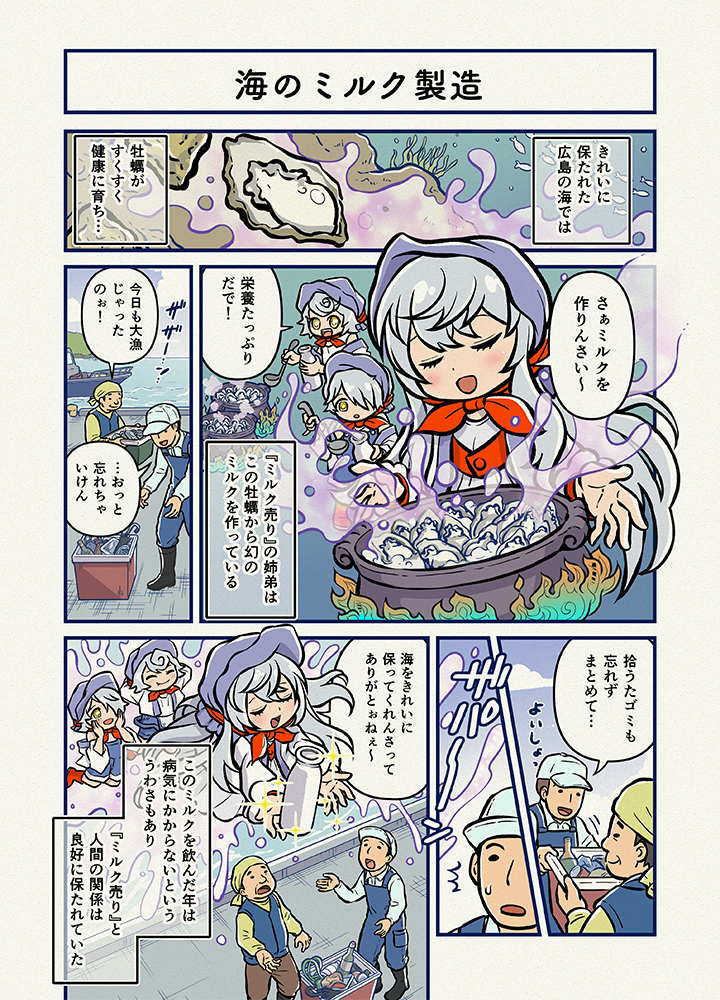 広島の海に生息する牡蠣を守る妖怪の三姉弟は、牡蠣からミルクを作っていてミルク売りと呼ばれているんだ。
